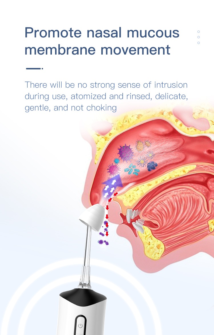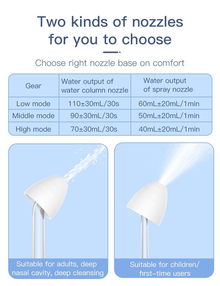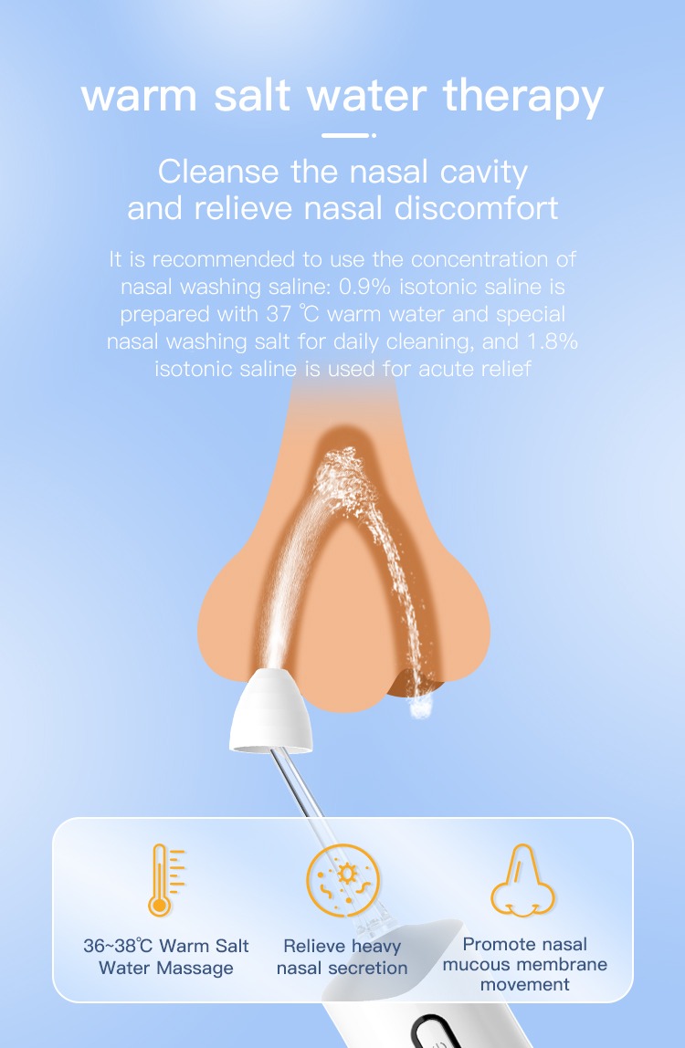 【90-graders roterende spidser】 Næserensens 360-graders roterende spidsdesign er mere effektivt end Neti-gryden eller andre næseskylleanordninger. Med IPX7 vandtæt design giver næseskylleren mulighed for at skylle hele kroppen med vand, hvilket er lettere at rengøre og pleje din næsehule. |