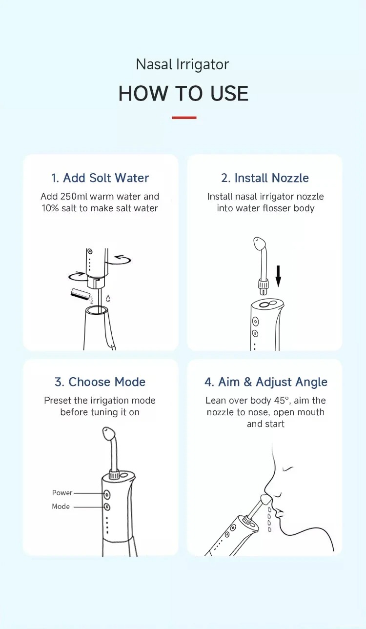 Motordrevet drift: I modsætning til traditionelle manuelle næseskyllere er elektriske næseskyllere drevet af elektricitet, typisk ved hjælp af genopladelige batterier eller en AC-adapter.