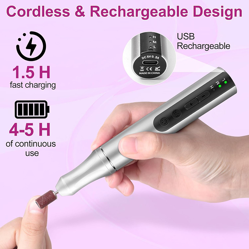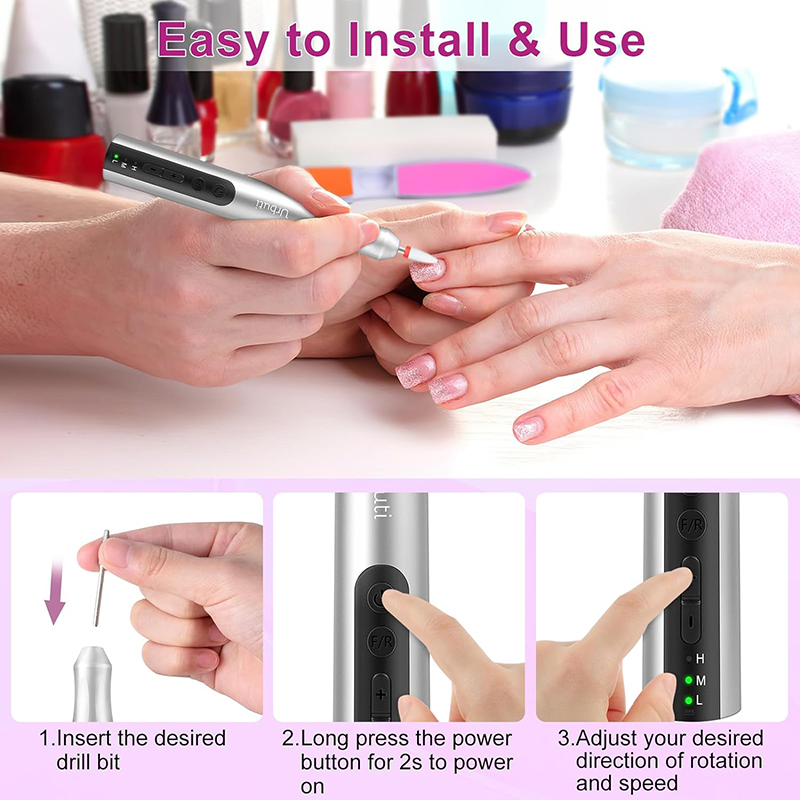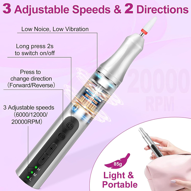 Neglefiler professionel er designet med 3 hastigheder på 6000-12000-20000, tryk blot kort på + eller - knappen for at øge eller mindske hastigheden. Nem at justere hastigheden og spare tid ved slibning af negle. Borets retning kan nemt ændres ved at trykke på F/R-knappen, ideel til venstrehåndede, mestre neglekunstnere eller begyndere til neglepleje.