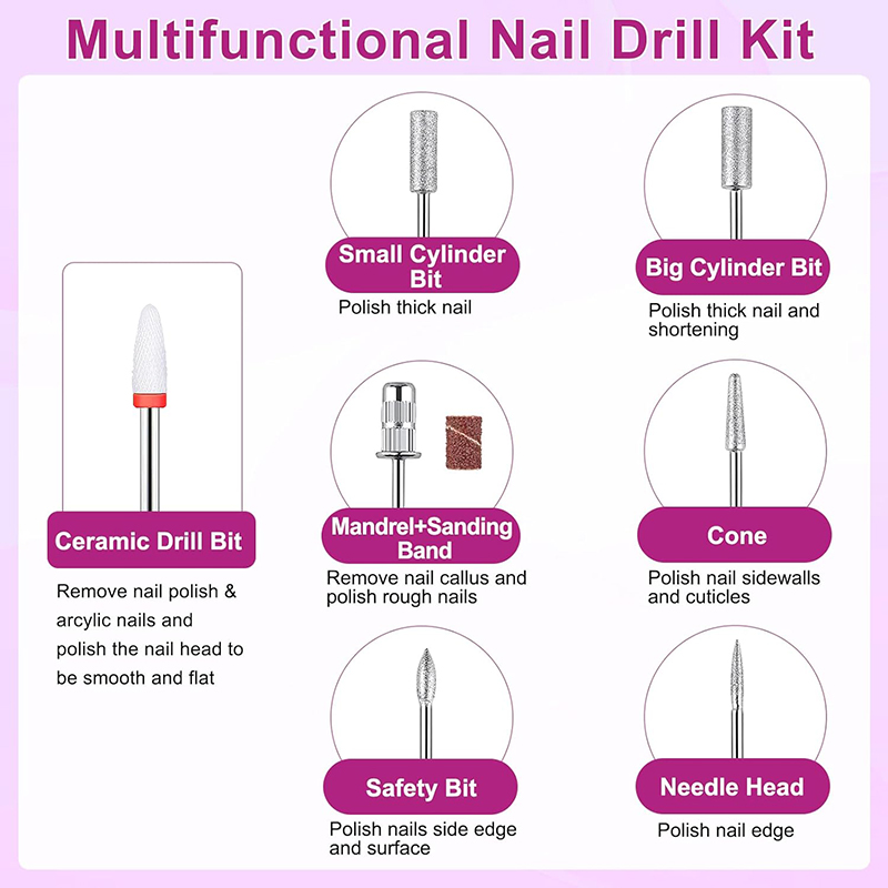 Sømboremaskine inkluderer 6 sømbor i rustfrit stål, 1 keramisk bor og 36 udskiftelige slibestrimler. Manicure pedicure kit kan bruges til manicure, pedicure, polering, formning, neglebåndsslibning, akryl/gel neglefjernelse eller til negle skønhed. Komplet med tilbehør og nem at bruge, perfekt til nybegyndere til neglekunst!