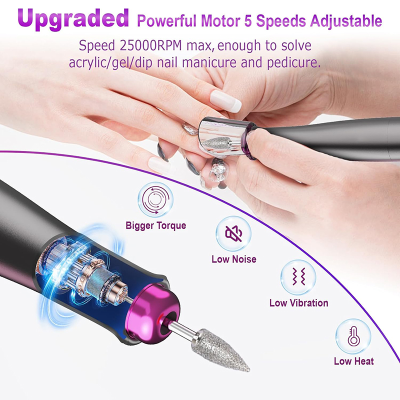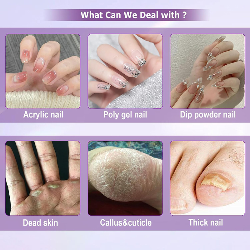 Elektrisk negleboremaskine Opgraderet kraftig motor er perfekt til alle dine manicure- og pedicure-behov, inklusive fjernelse af akrylnegle, polygel-negle, biller-gel, dip-puddernegle, neglebånd, død hud, hård hud og tykke negle.