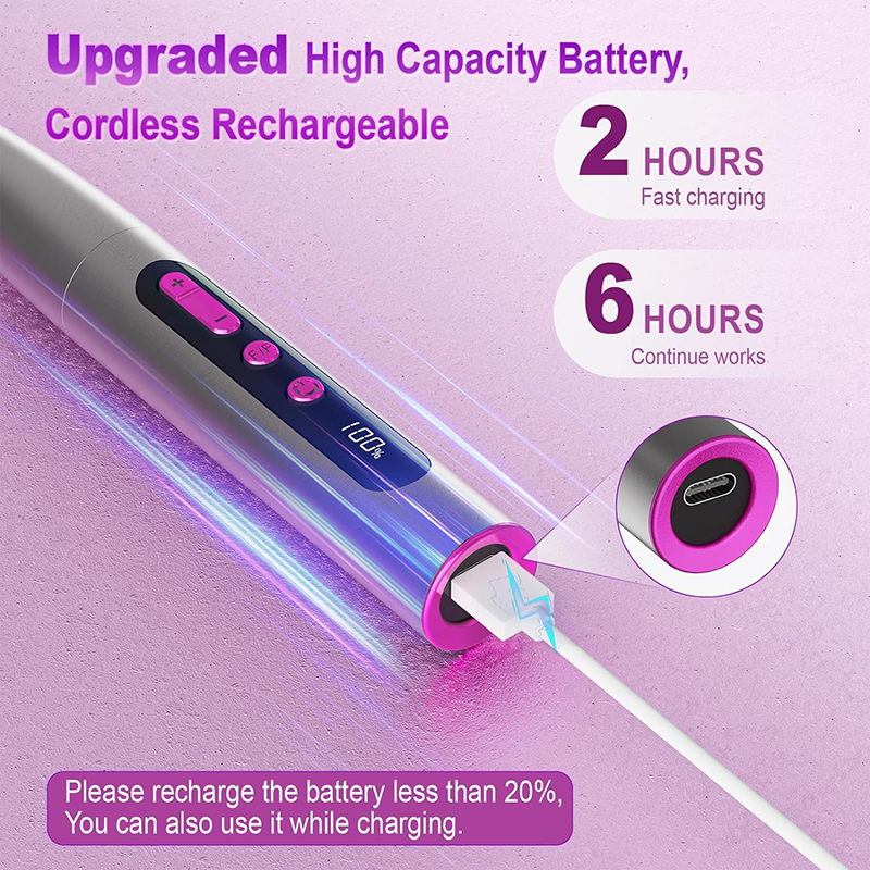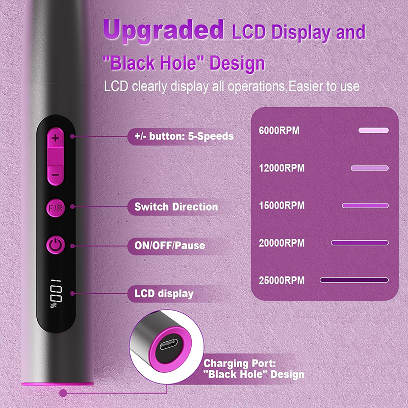 elektrisk sømboremaskine Opgraderet højkapacitetsbatteri, 2 timers hurtig opladning og 6 timer Fortsæt virker. Elektrisk neglefil er velegnet til din USB-strømadapter, laptop, mobilstrøm osv. Hvis den ledningsfrie negleboreeffekt er mindre end 20%, kan du også bruge den under opladning.