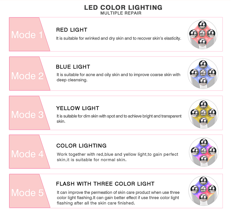 6-I-1 HUDPLEJE RUTINE --RF designet 6 tilstande i henhold til den daglige hudplejerutine. De er #PNETRATION for at forbedre hudens absorption,#CLEANING for en grundig ansigtsrensning,#SPECIAL for øjenpleje,#LIFTING for at opstramning og opstramning af huden, og #COOL for at berolige og sterilisere huden.