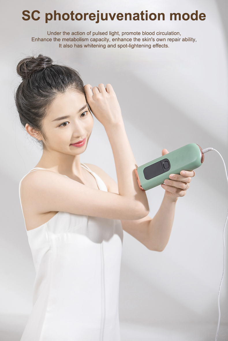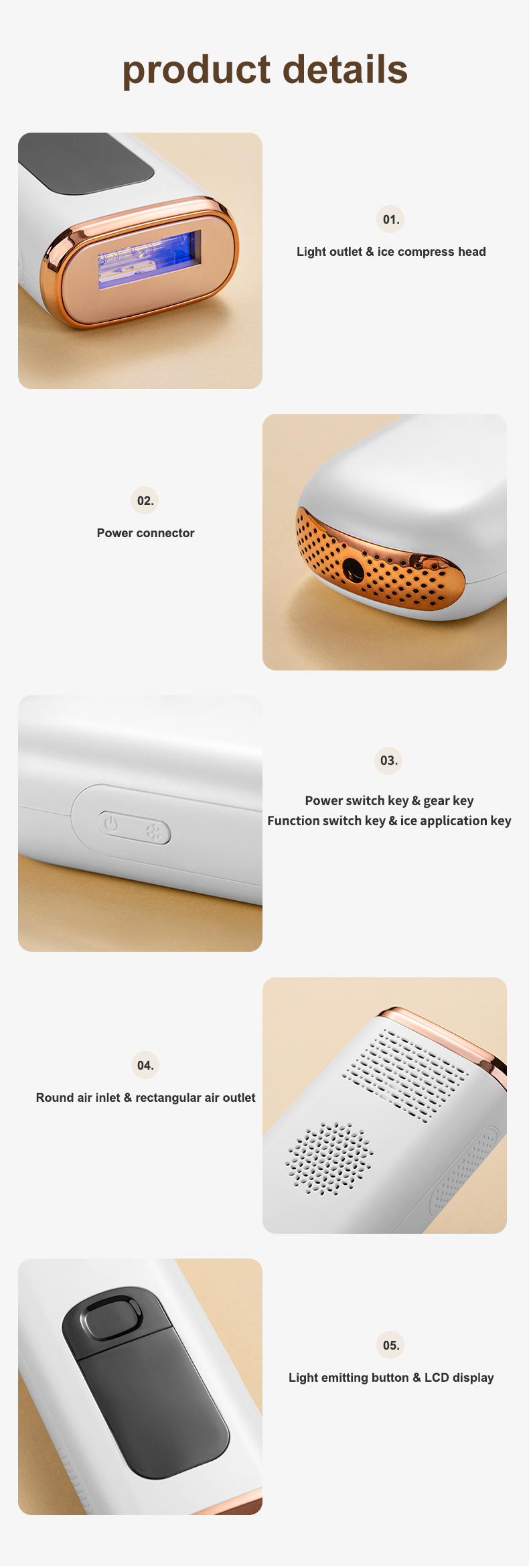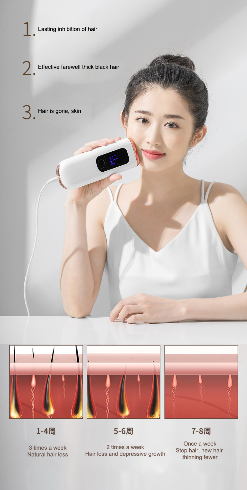 (Bemærk: 1, Ikke egnet til tatoveret og overgarvet hud, sårede områder og gravide. 2, Det er en plug-in enhed, hold venligst altid enheden tilsluttet til strøm under behandlingen. )
