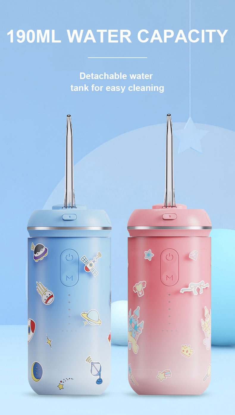 - Easy to Use and Hold for Children: This water dental flosser is designed to fit children's palms, has a smart memory function and simple one-button operation,the back has a concave and convex anti-slip design.The included cute stickers allow kids to customize and decorate the floss with their favorite characters. The water tank capacity is 190 ml, so you don't need to add water frequently during use.