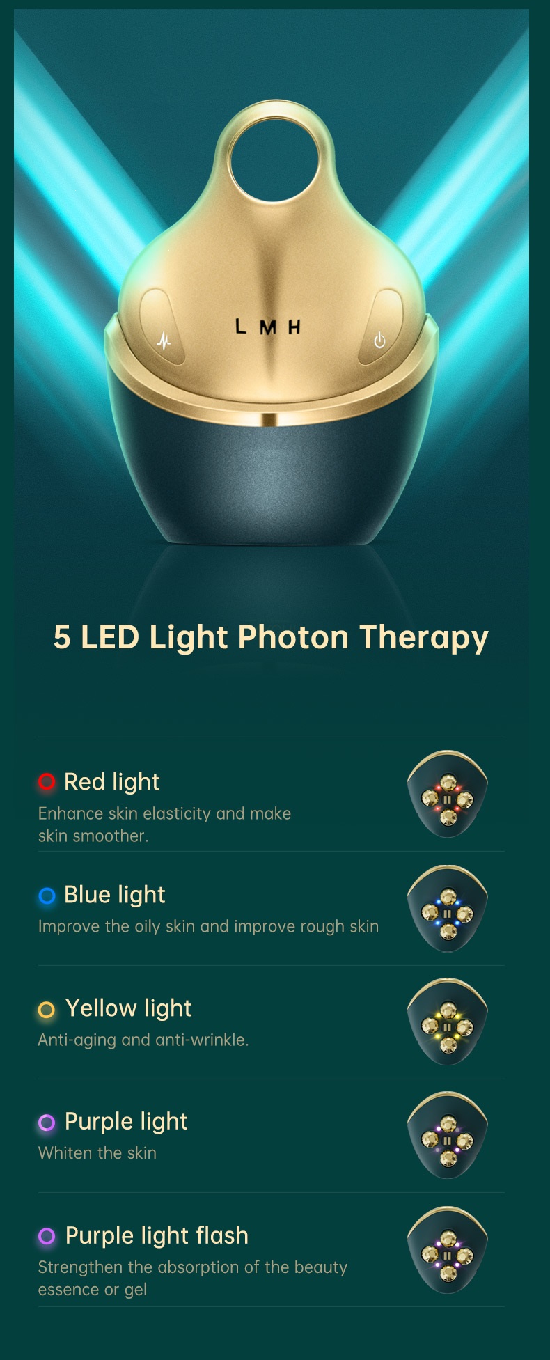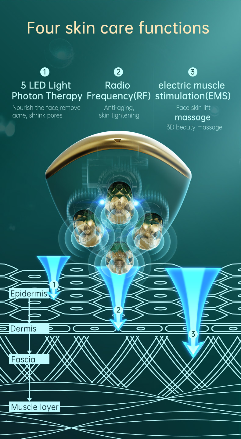HVAD ER FORDELENE? -- Skønhedsmaskine er en multifunktionel anti-aldringsenhed, der inkluderer radiofrekvensteknologi (RF) med rød/blå lysterapi, EMS for at reducere linjer og rynker, forbedre hudpenetration og absorptionsevner osv.