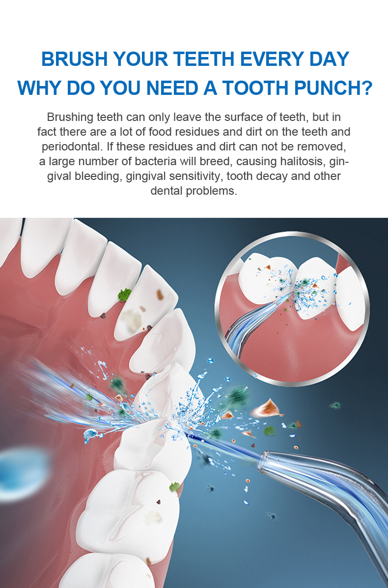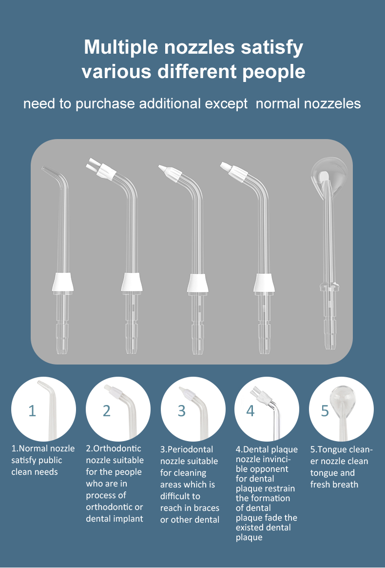 Denne vandtandplukker leverer høje vandtryksimpulser med 1400-1800 gange i minuttet, og fjerner effektivt 99,9% af tandplak til dyb tandrensning. Denne vandtandhakke masserer tandkødet, fremmer blodcirkulationen og behandler orale problemer som dårlig ånde, ortodontiske tænder