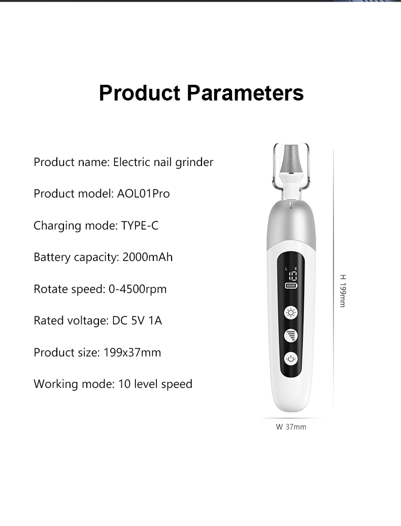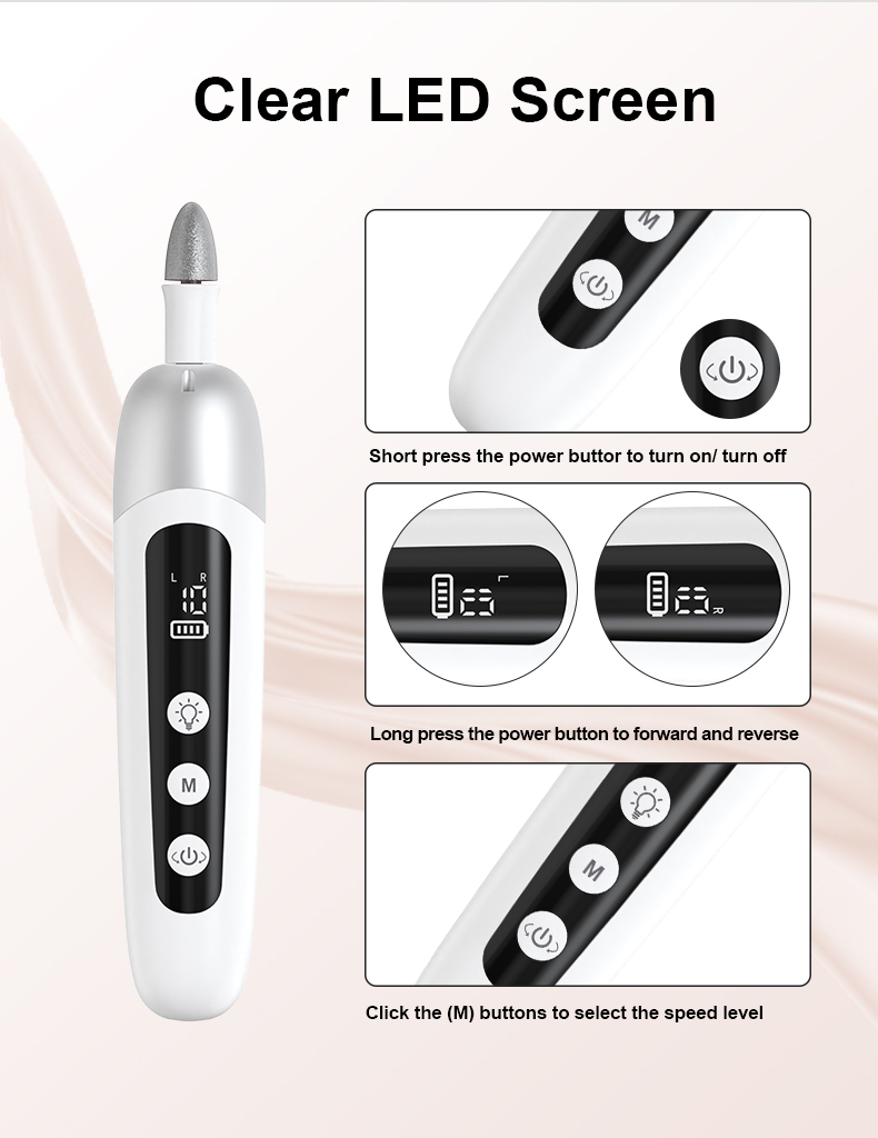 - INNOVATIV LED-DISPLAY: Naviger problemfrit i ønskede indstillinger med lethed. LED-displayet viser batteristatus, hastighedspræference og rotationsindstillinger for ubesværet betjening. Den elektriske neglefilmaskine er også udstyret med et integreret LED-lys, der oplyser områder på hænder og fødder